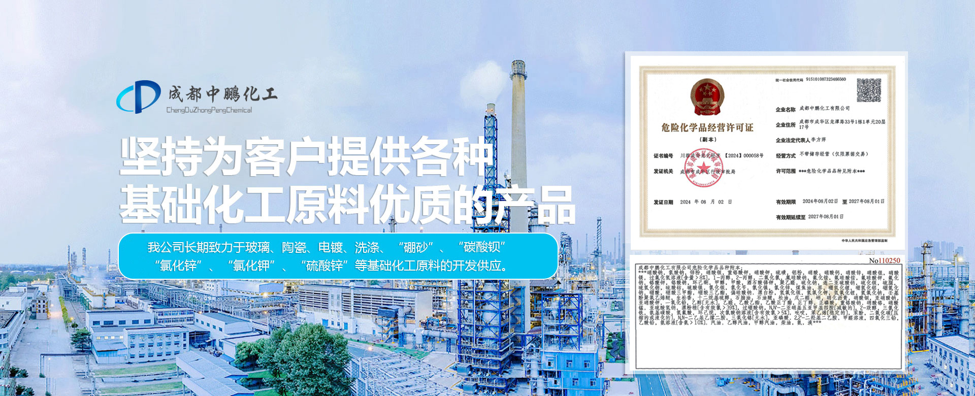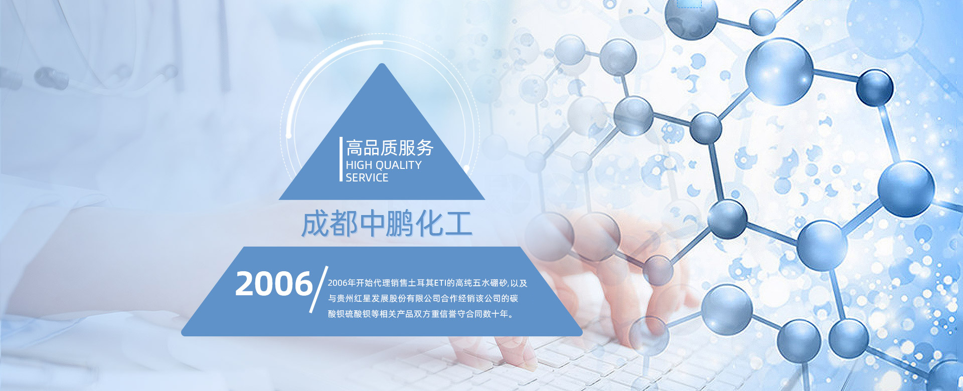 成都中鵬化工有限公司成立于2001年,位于成都市新都區(qū)木蘭木名商塑化城2棟11號,公司成立16年以來,一直堅持為客戶提供各種基礎化工原料的產品。我公司長期對于玻璃、陶瓷、電鍍、洗滌、“硼砂”、“碳酸鋇”、“氯化鋅”、“氯化鉀”、“硫酸鋅”等基礎化工原料的開發(fā)供應。 公司現(xiàn)在員工上百人,在全國擁有多個營銷體系和完善的售后服務體系,長期以來,通過為客戶提供各種基礎化工原料的產品,形成了良好的合作關系...